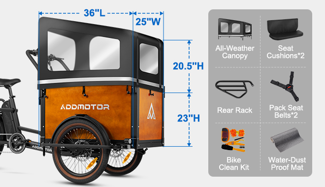 electric cargo bike is engineered around a front‑loading cargo module designed for stability, versatility, and real‑world utility across family and commercial scenarios. The cargo box measures 36" × 25" × 23", providing a low‑center‑of‑gravity platform that enhances handling while maximizing usable volume for children, pets, groceries, or delivery payloads. Its reinforced structure and weather‑resistant materials ensure durability under daily use, while integrated mounting points support modular accessories such as child seats, tie‑downs, and cargo organizers.